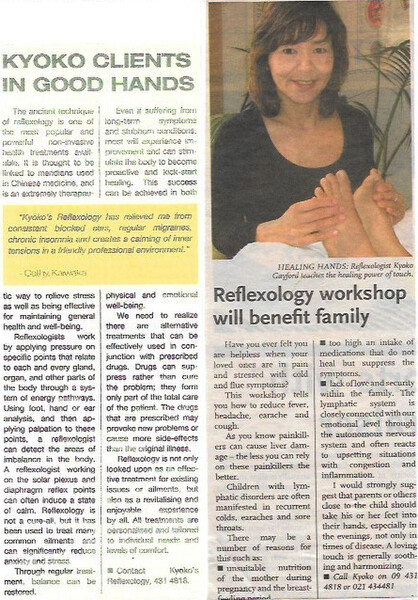 Kyoko Gayford has been practicing Reflexology since 2002. She first trained in Japan and has attended post graduate reflexology courses in Los Angeles, Tokyo, Cairns Australia, Christchurch and Hamilton, covering Cranio Sacral Reflexology, Ear Reflexology, Reflexology for Menopause, Scar Tissue Treatment, TCM (Meridian Reflexology) and more. Since moving to NZ Kyoko has obtained her professional Diploma of Reflexology and brings over fourteen years of experience to each client and their individual needs.