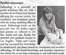 Reflexology is beneficial for many ailments. Kyoko's One Hour Reflexology treatment stimulates the whole body's vital organs by applying pressure to reflex points with TCM, and Chakra Balancing.